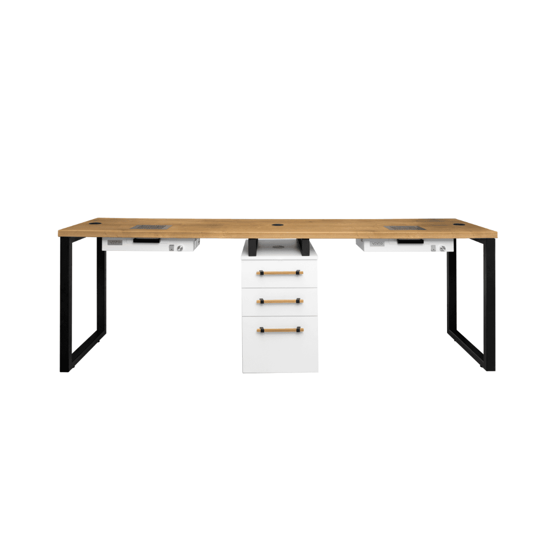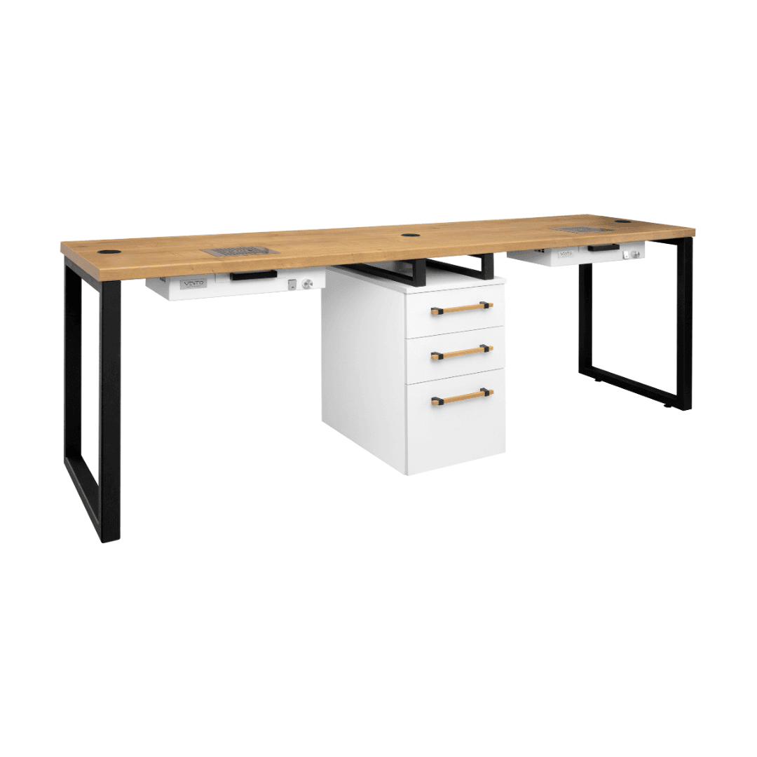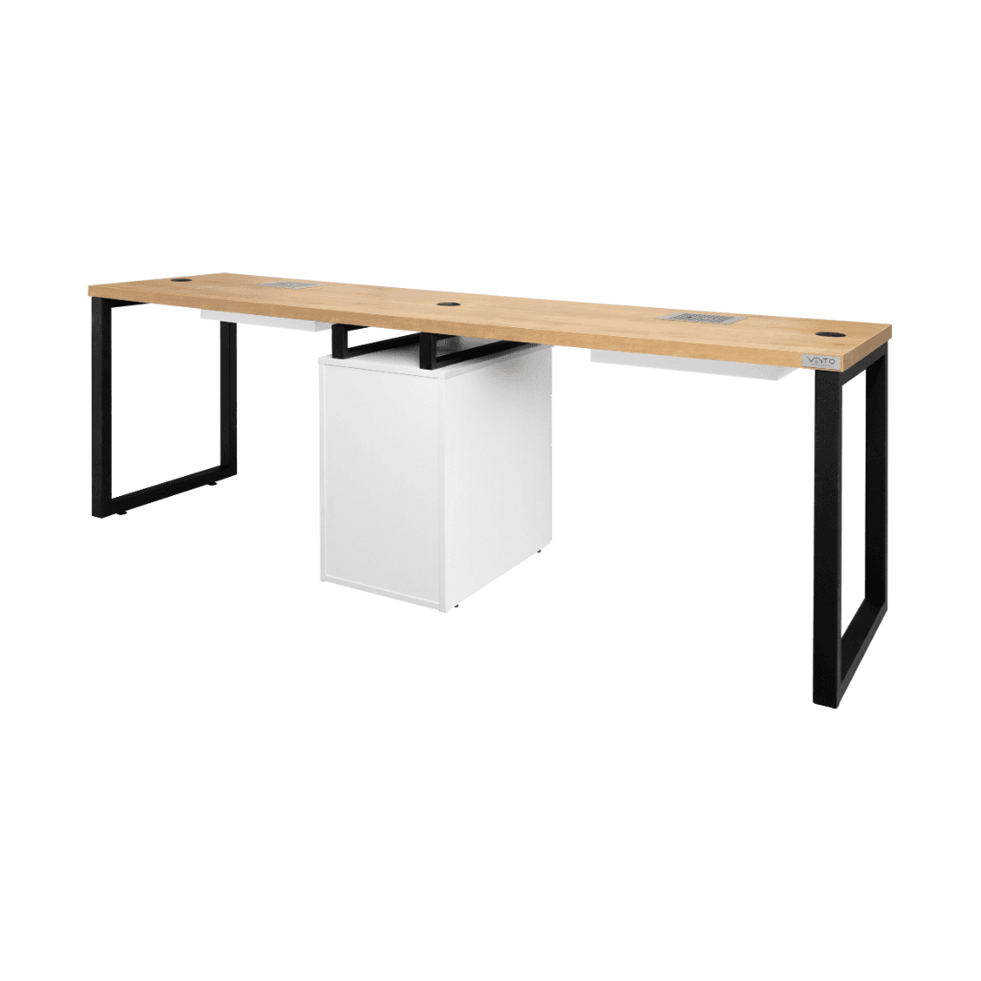 Biurko Doppio 3 z pochłaniaczami pyłu VENTO PRO PLUS bądź bez pochłaniaczy (opcja do wyboru) - dwustanowiskowe - zostało wykonane z najwyższej jakości materiałów – blat pokryty został antybakteryjną powłoką stosowaną w laboratoriach. Zarówno powierzchnia blatu jak i reszta elementów jest matowa i odporna na zarysowania oraz chemię używaną podczas stylizacji paznokci. Nasze biurko to produkt zaprojektowany od A do Z z myślą o Twoich