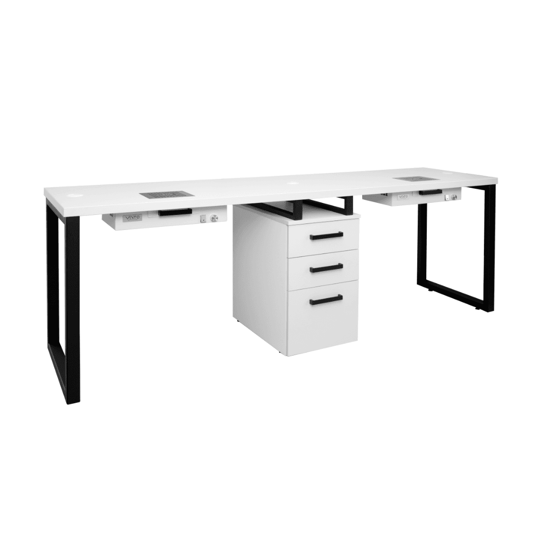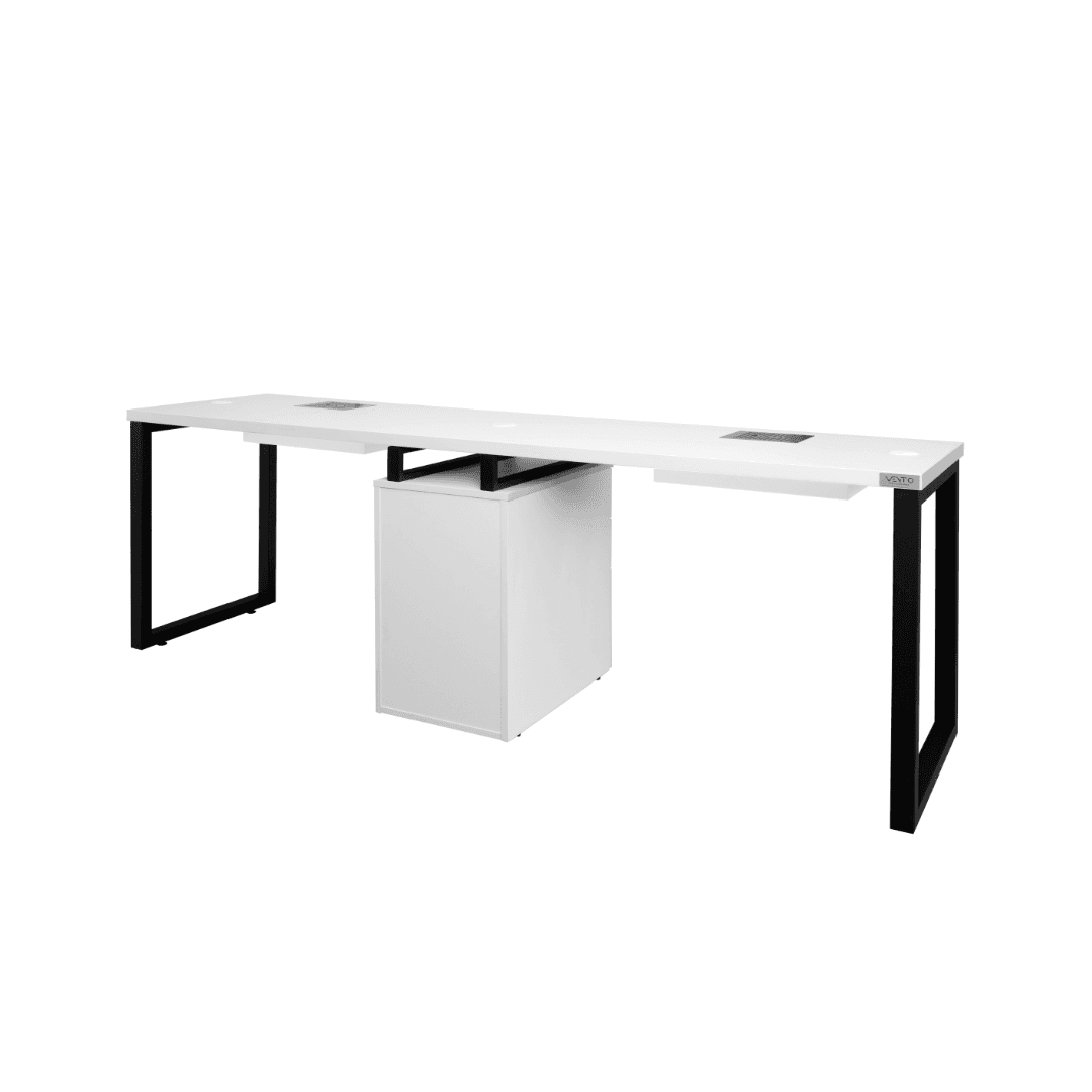 Biurko Doppio 3 z pochłaniaczami pyłu VENTO PRO PLUS bądź bez pochłaniaczy (opcja do wyboru) - dwustanowiskowe - zostało wykonane z najwyższej jakości materiałów – blat pokryty został antybakteryjną powłoką stosowaną w laboratoriach. Zarówno powierzchnia blatu jak i reszta elementów jest matowa i odporna na zarysowania oraz chemię używaną podczas stylizacji paznokci. Nasze biurko to produkt zaprojektowany od A do Z z myślą o Twoich