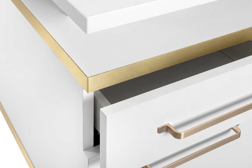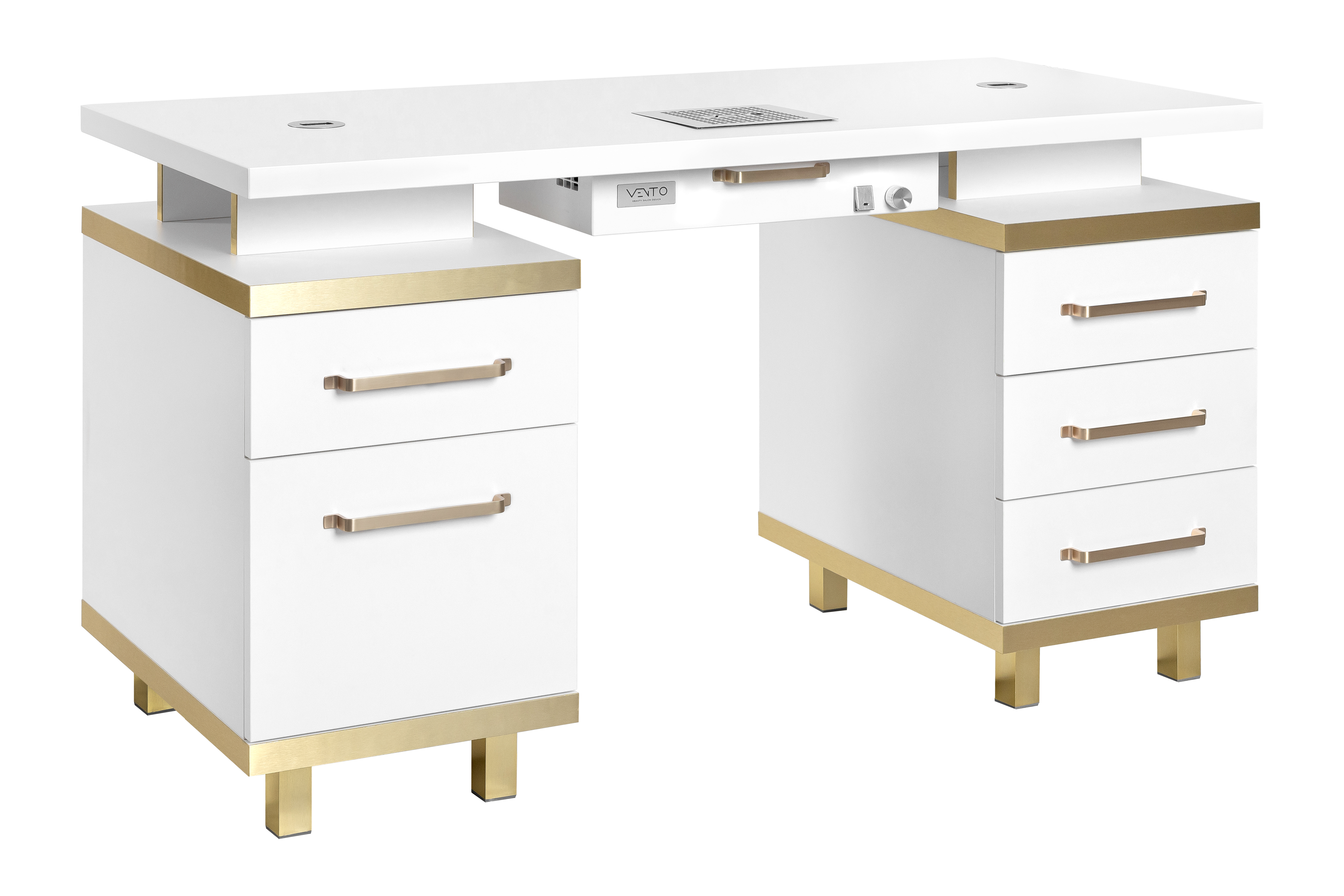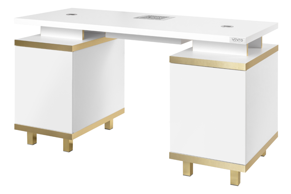 Biurko Elegante Bianco z pochłaniaczem pyłu VENTO PRO PLUS przynosi harmonię funkcjonalności i estetyki. Jego biały kolor jest w krok z najnowszymi trendami. Dodaje świeżości i elegancji każdemu salonowi paznokci. Posiada złote, podłużne uchwyty oraz nóżki. Biurko Elegante Bianco emanuje luksusem, tworząc przyjemną atmosferę pracy.