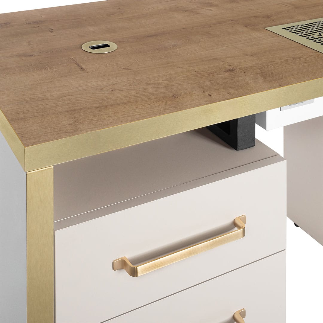 Luksusowy design – elegancki, delikatny kaszmir w połączeniu ze złotymi, podłużnymi uchwytami, złotym obramowaniem oraz drewnianym blatem nadaje wyjątkowy styl każdemu salonowi kosmetycznemu.