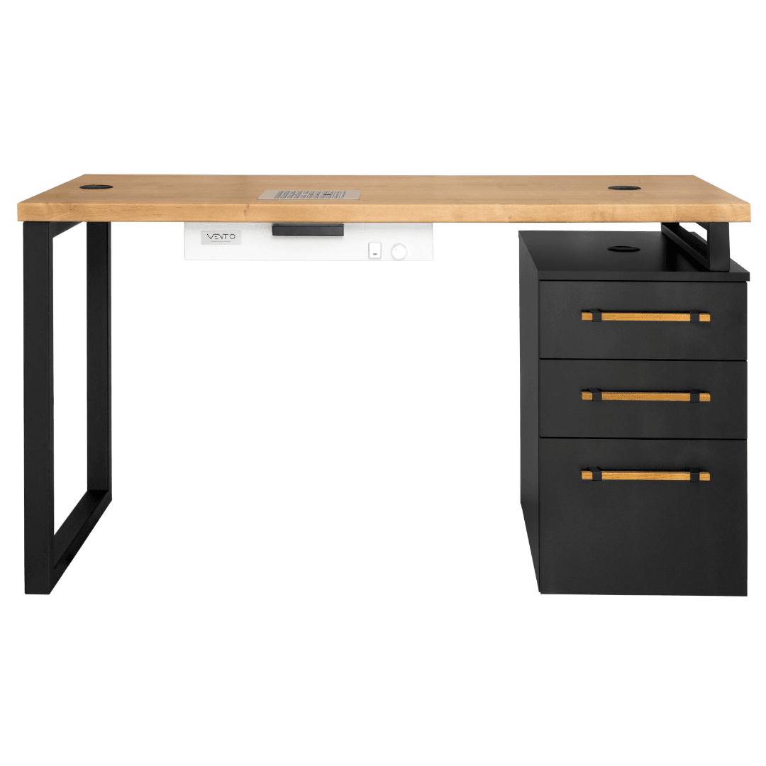 Biurko Moderno 1 z pochłaniaczem pyłu VENTO PRO PLUS bądź bez pochłaniacza (opcja do wyboru) – drewniany blat połączony został z czarnym kontenerem. Całość przełamują podłużne drewniane uchwyty oraz nogi w kolorze czarnym.