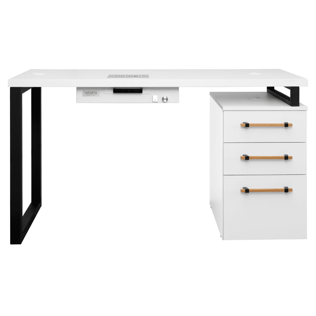 Biurko Moderno 5 z pochłaniaczem pyłu VENTO PRO PLUS bądź bez pochłaniacza (opcja do wyboru) – biały blat połączony został z białym kontenerem. Całość przełamują podłużne drewniane uchwyty oraz nogi w kolorze czarnym.