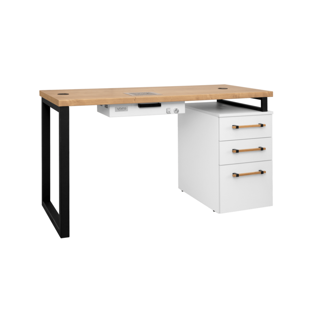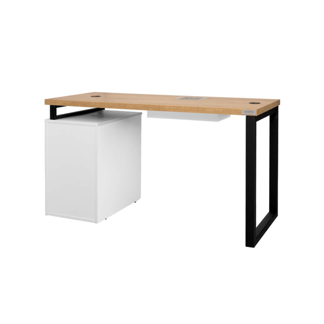Biurko Moderno 6 z pochłaniaczem pyłu VENTO PRO PLUS – drewniany blat połączony został z białym kontenerem. Całość przełamują podłużne drewniane uchwyty oraz nogi w kolorze czarnym.