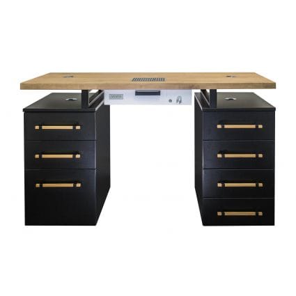 Biurko Moderno Duo 1 z pochłaniaczem pyłu VENTO PRO PLUS bądź bez pochłaniacza (opcjonalnie) to elegancka i funkcjonalna propozycja do nowoczesnych wnętrz. Charakteryzuje się ono prostą formą, która doskonale wpasuje się w estetykę loftowych salonów. Wykonane z połączenia drewnianego blatu z czarnymi kontenerami oferuje zarówno estetykę, jak i praktyczność.