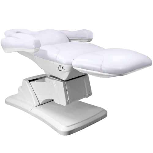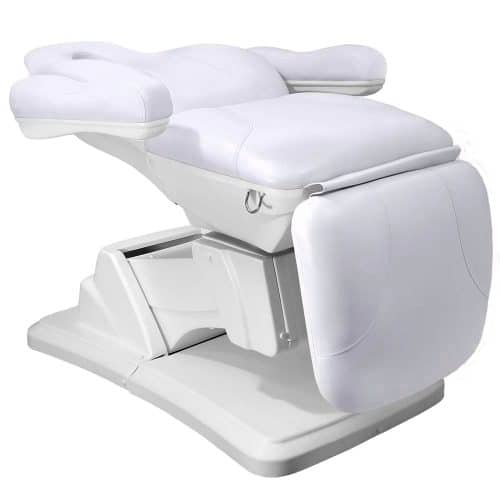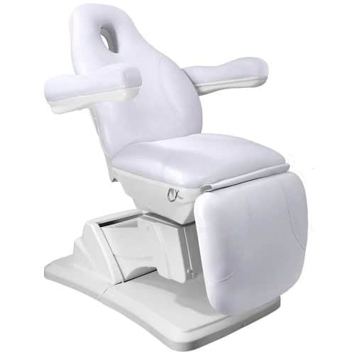 Profesjonalny fotel kosmetyczny. Posiada otwór w zagłówku. Wykonany z wysokiej jakości skóry ekologicznej łatwo zmywalnej. Fotel posiada elektrycznie sterowaną wysokość, regulację oparcia i podnóżka oraz kąt podparcia siedzenia Sterowanie pilotem ułatwia pracę. Usytuowany na stabilnej podstawie. Siedzisko idealnie wyprofilowane z podłokietnikami. Idealne do gabinetów kosmetycznych, Spa, masażu. Łatwy w obsłudze. Dostępny w białym kolorze. Podłokietniki wyjmowane.
