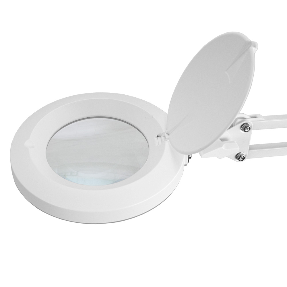 Lampa montowana jest do blatu biurka za pomocą solidnego uchwytu typu CLIP, co gwarantuje stabilność oraz oszczędność miejsca na stanowisku pracy. Wyposażona została w funkcję ściemniacza, umożliwiającą regulację natężenia światła i dopasowanie go do indywidualnych potrzeb oraz warunków wykonywanego zabiegu. Dodatkowym atutem jest klapka ochronna na lupę, która zabezpiecza szkło przed zabrudzeniem i uszkodzeniem. Lampa wykonana jest z wysokiej jakości materiałów, a emitowane przez nią światło jest przyjazne dla wzroku i nie powoduje zmęczenia nawet podczas długotrwałej pracy. Ergonomiczna konstrukcja sprawia, że urządzenie jest wyjątkowo funkcjonalne i komfortowe w codziennej eksploatacji.