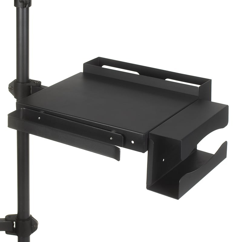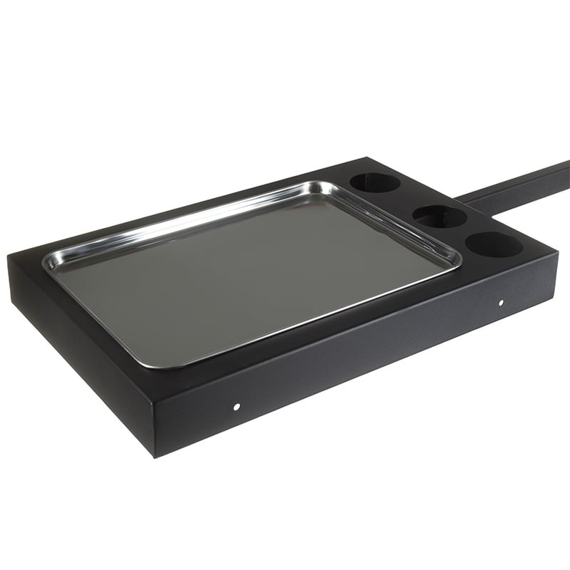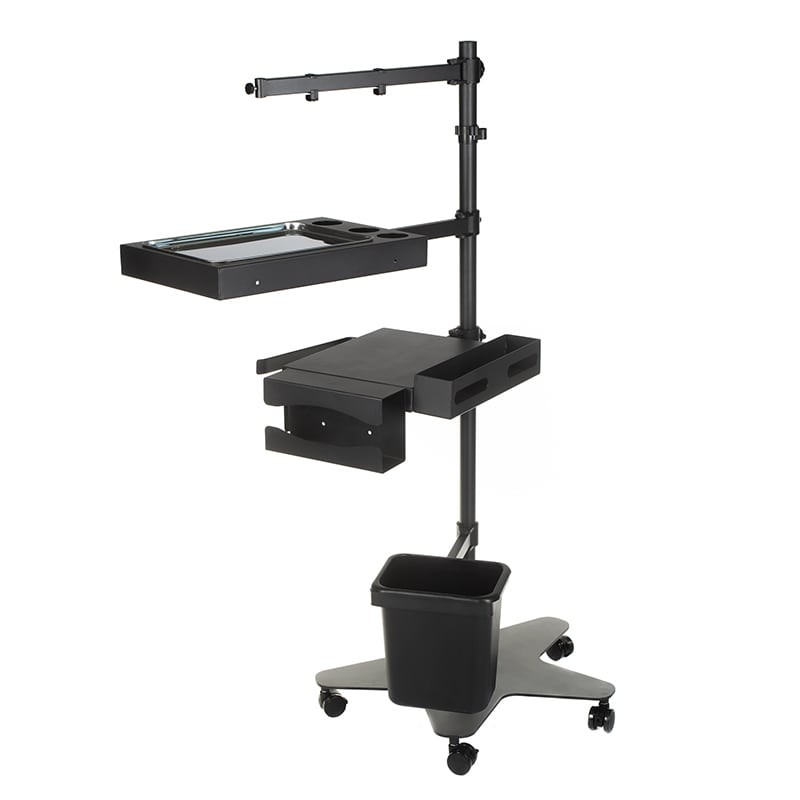 Rozbudowana stacja robocza JANE marki INKOO wykonana z najwyższej jakości materiałów. Malowana proszkowo, w kolorze czarnym. Stabilna dzięki ciężkiej, solidnej podstawie na podgumowanych kółkach. Wyposażona w niewielki blat roboczy z praktycznymi uchwytami, drugi blat z chromowaną tacką, pojemnik na odpady oraz uchwyt na folię lub papier. Dodatkowo ma możliwość zamontowania lampy roboczej marki INKOO dostępnej także w naszej ofercie. Każdy z elementów można ustawić na dowolnej wysokości statywu.
