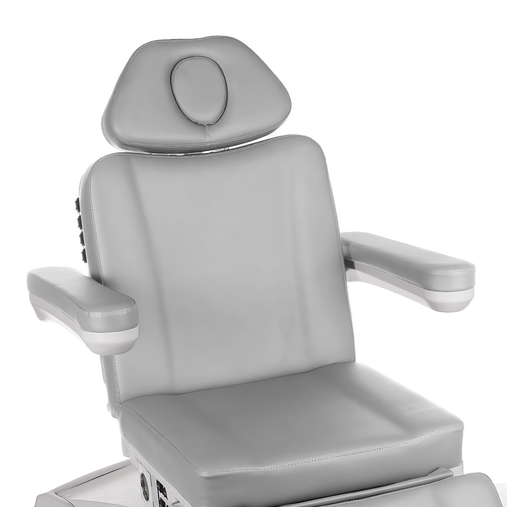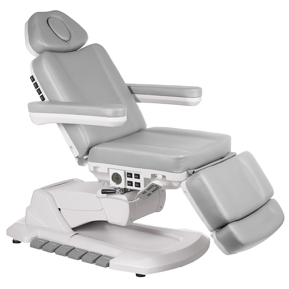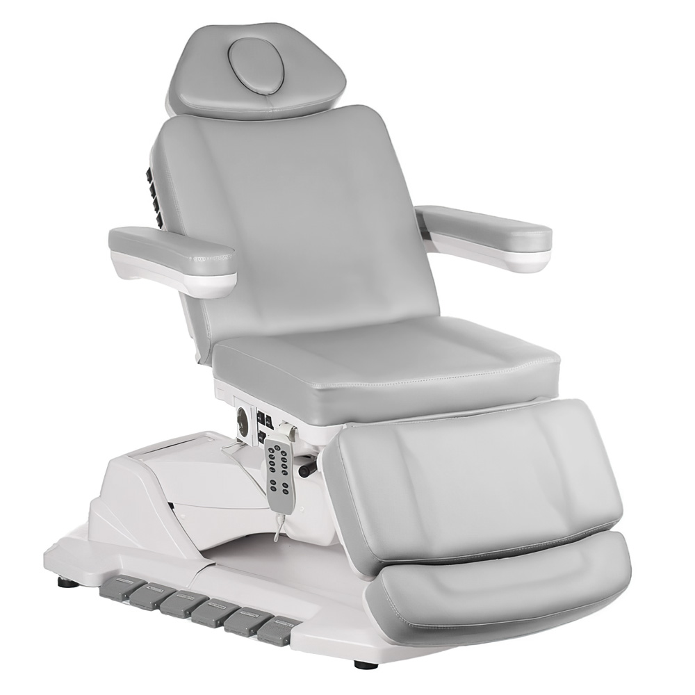 Elektrycznie regulowana wysokość siedziska, kąt podparcia pleców, podnóżek i tzw kołyska.