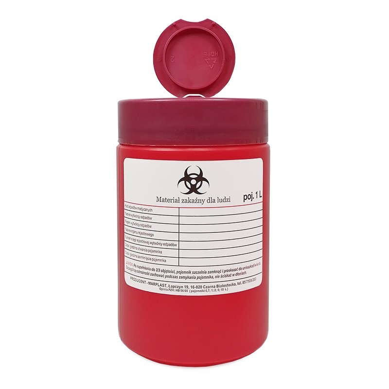 Pojemniki na odpady medyczne posiadają atest PZH. Zaopatrzone są w etykietę z międzynarodowym znakiem ostrzegawczym i instrukcją użytkowania. Otwór wrzutowy o średnicy do 90mm dla pojemników od 1 do 10 litrów.