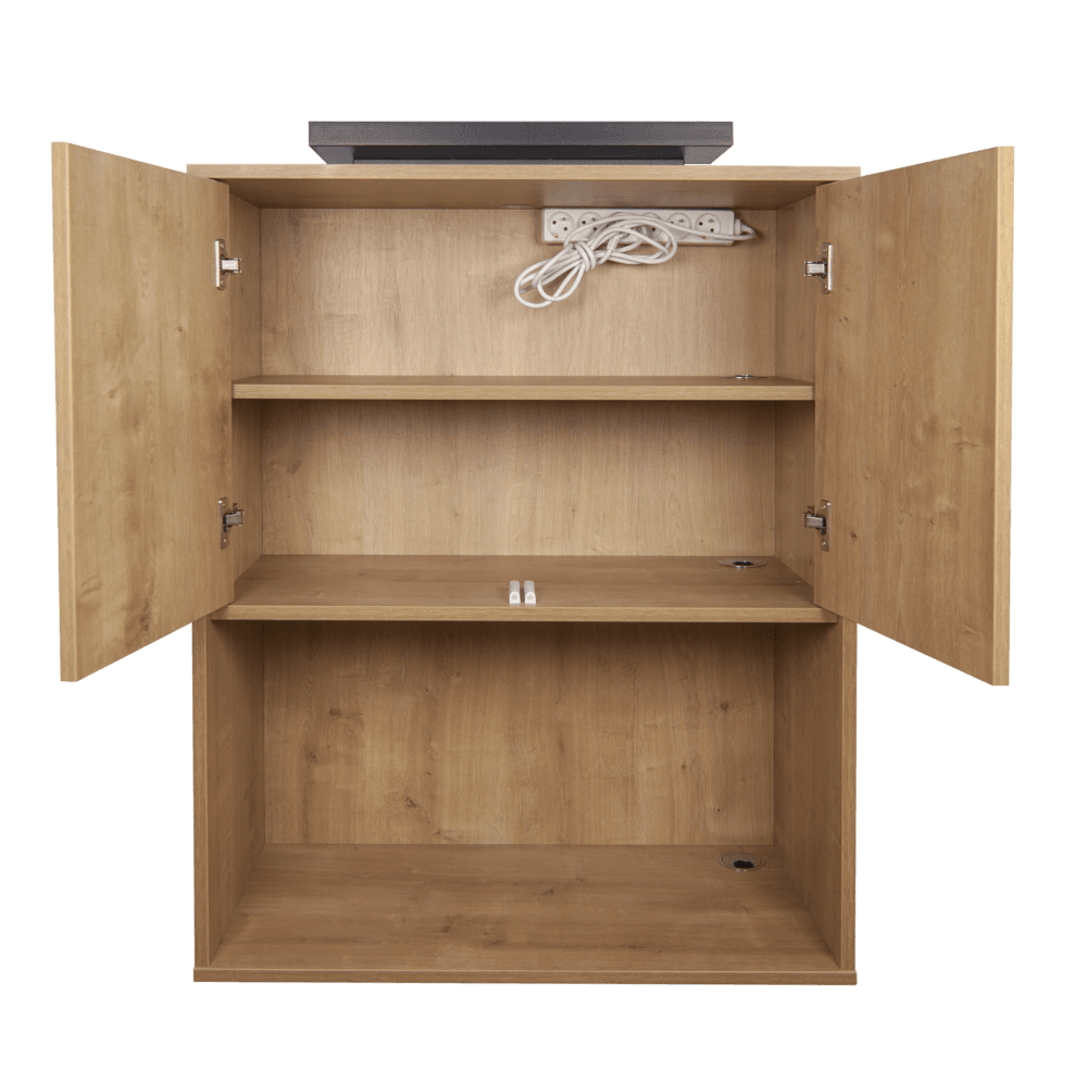 Od strony roboczej recepcja posiada dwie głębokie półki, jedna z nich jest zamykana i posiada w środku dodatkową półkę oraz gniazdo prądowe w ilości 5 sztuk do podłączenia ładowarki, laptopa, kasy fiskalnej lub innych niezbędnych urządzeń.