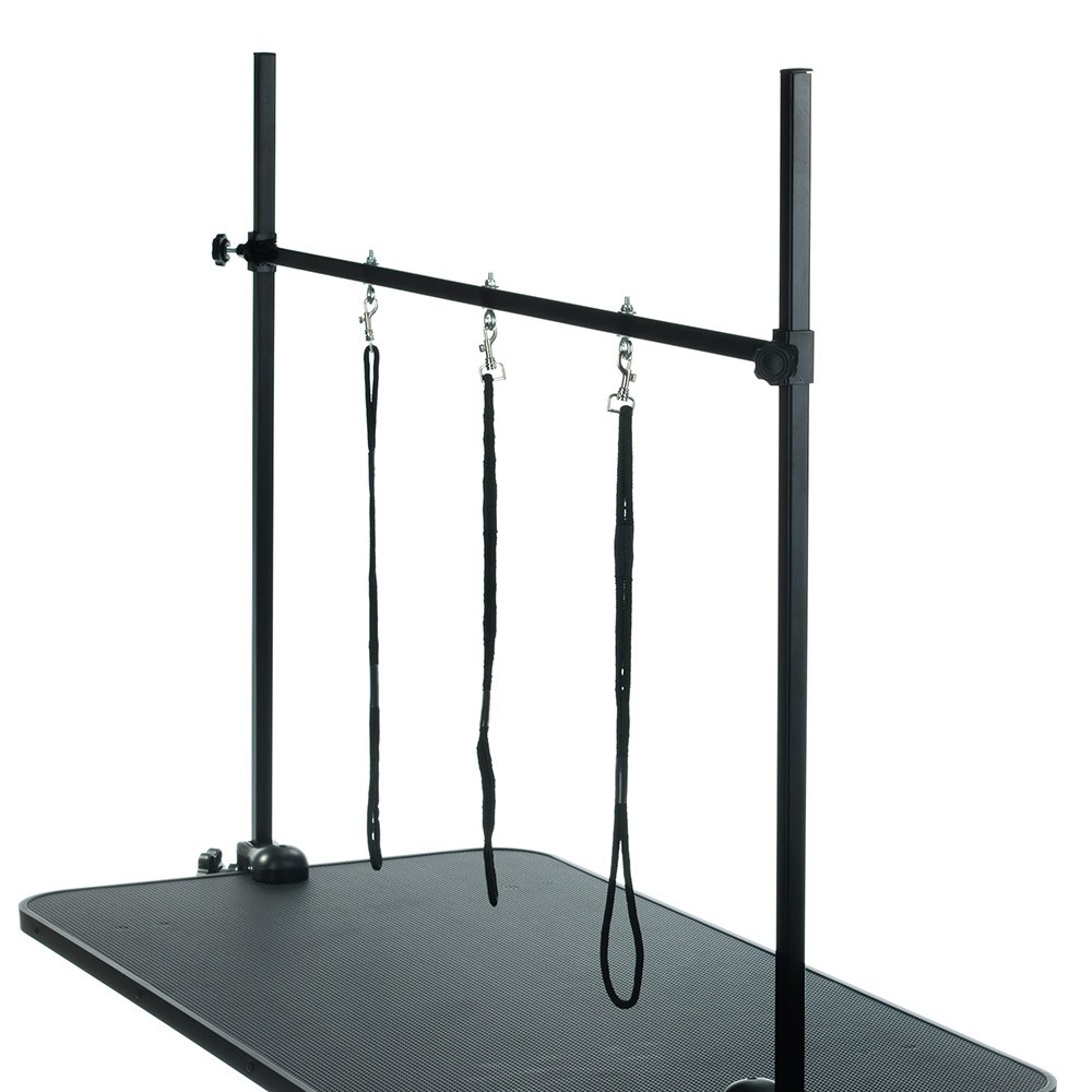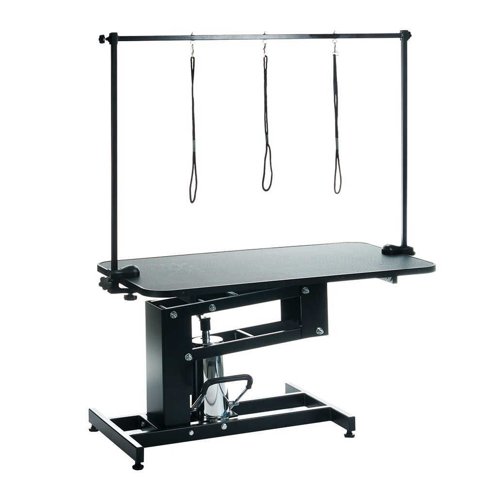 Stół groomerski do pielęgnacji zwierząt XL. Niezwykle stabilny blat pokryty matą antypoślizgową w kolorze czarnym. Rama stalowa w kolorze czarnym, malowana proszkowo. Wysokość blatu regulowana hydraulicznie, dzięki czemu stół dopasujemy idealnie pod potrzeby swoje oraz rozmiar pupila. W zestawie regulowana na wysokość poprzeczka z trzema smyczami.